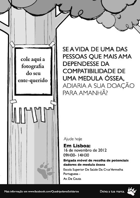 A Ursa lançou a ideia e a mensagem correu como rastilho de pólvora por essa blogosfera fora. Vai organizar-se até ao final do ano, por todo o país, uma mega campanha de angariação de dadores de medula óssea. As bloggers quadripolares, fãs d’A Ursa, uniram-se e estão a tratar de tudo quanto será preciso para organizarem a ida de uma brigada de angariação e registo de novos dadores ao seu distrito fazer a recolha de novos dadores.