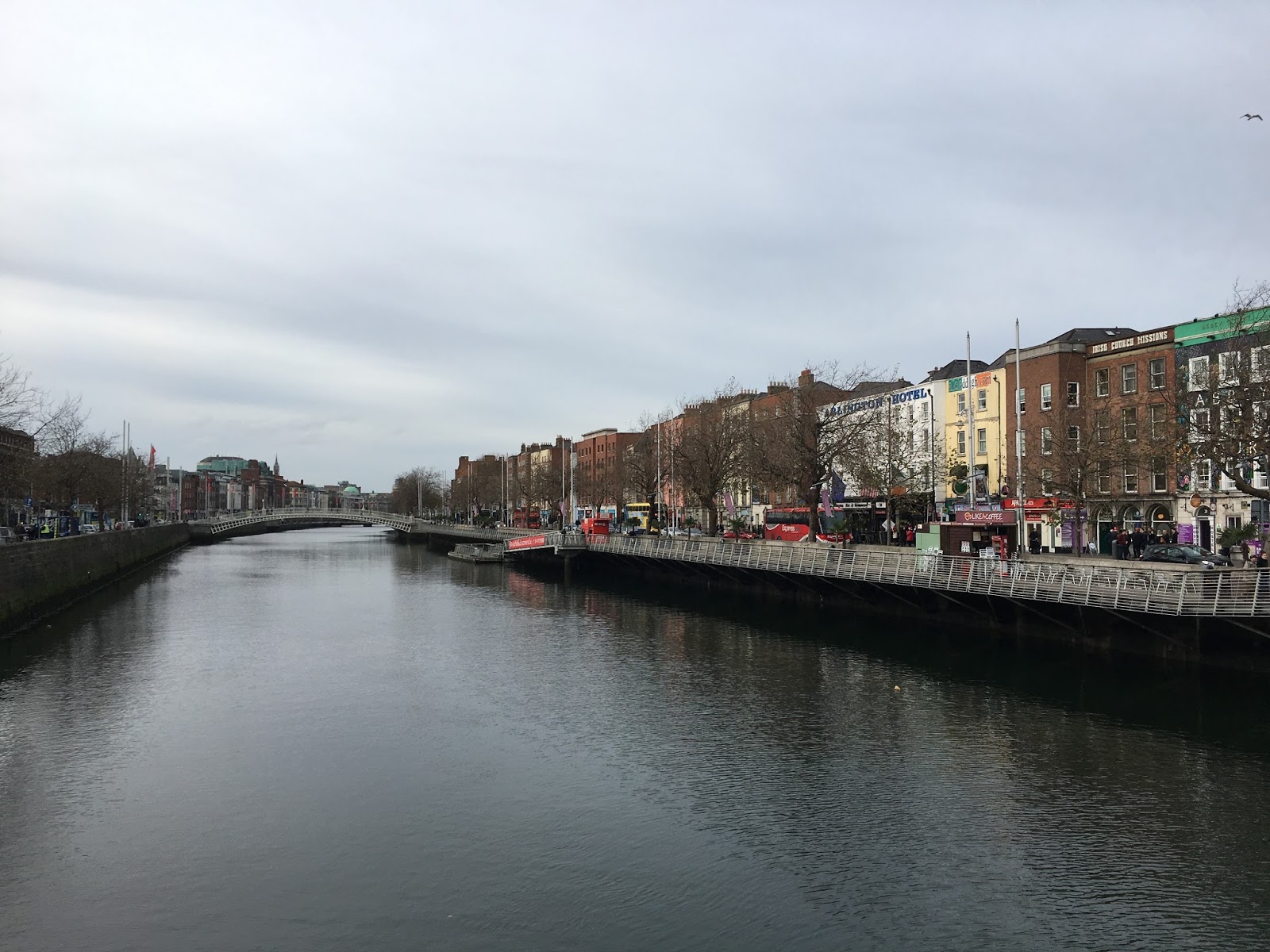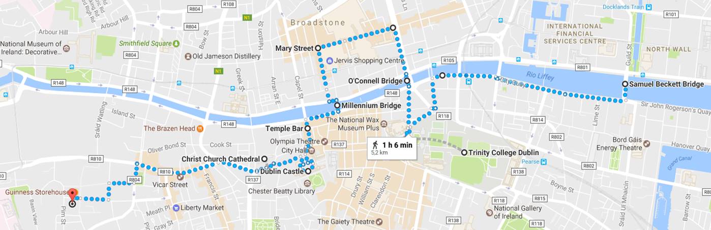 A sugestão é que comecem o dia junto ao rio, com uma caminhada desde a zona mais recente da cidade, com prédios novos, empresas internacionais, centros comerciais e hotéis, um pouco ao estilo da City em Londres mas de tamanho beeeeeeem menor. A última vez que tinha estado na cidade a zona ainda estava a ser requalificada, mas agora estava já com vida e ficou mesmo agradável para passear. Daqui vão até à zona do Trinity College, explorem os edifícios, visitem a biblioteca, se tiverem oprtunidade, desta vez apanhámo-la fechada mas é bem gira, os edifícios do parlamento e do baco da Irlanda que ficam mesmo em frente à entrada principal e depois voltem novamente até à zona do ria, e atravessem a O´Connell Bridge até à outra margem.