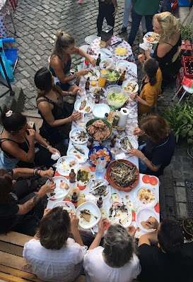 Cheguei à Baixa por volta das 20:00 e o ambiente já estava animadíssimo, ainda se passeava à vontade pela ribeira, mas já havia alguma dificuldade em passar entre grelhadores e manjericos nas ruas mais estreitas dos bairros. Abancamos para comer sardinhas e fêveras, beber umas cerveja, ouvir uma musiquinha, deitar conversa fora e ir animando para a noite que se avizinhava.