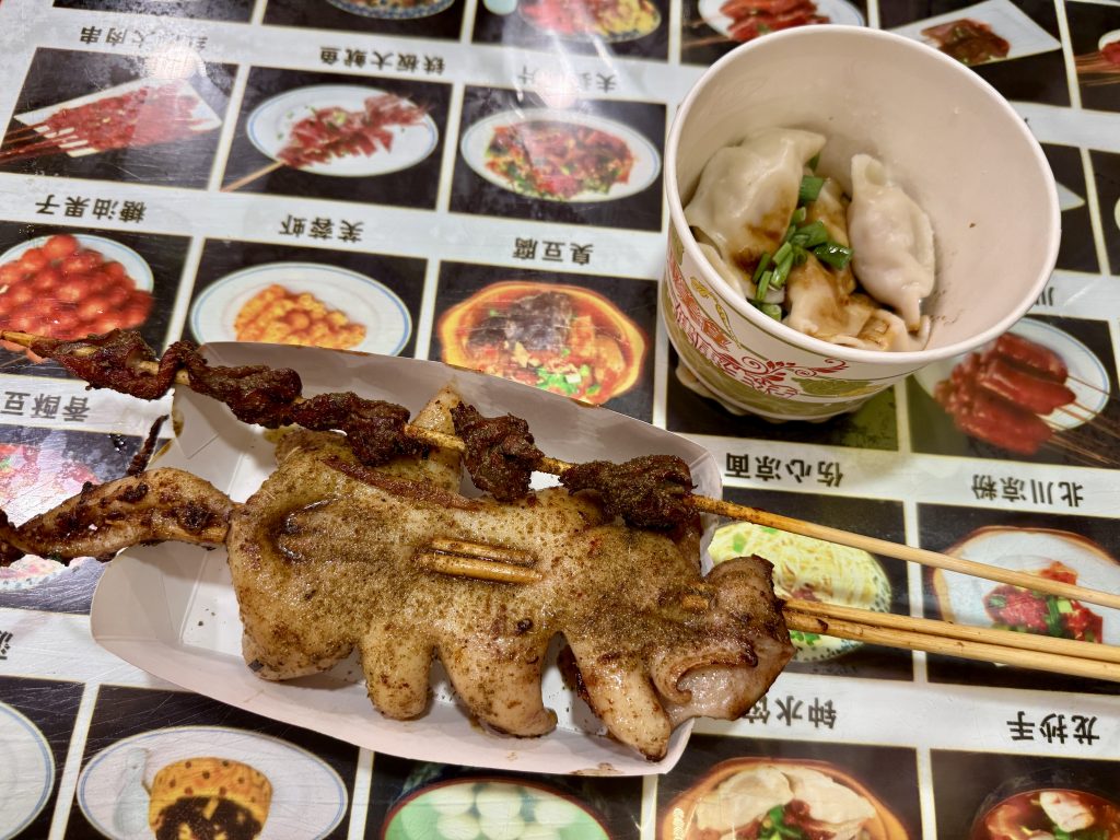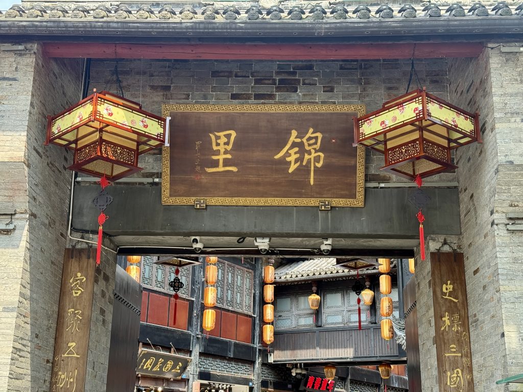 Esta zona histórica ganha vida à noite. Luzes suaves, bares com música ao vivo, lojas de design e restaurantes modernos misturam-se com arquitetura tradicional. Um conjunto de ruelas estreitas e movimentadas, o lado mais cosmopolita de Chengdu, onde tradição e modernidade se encontram. E onde se pode beber um cocktail com vista para um pátio centenário. Foi aqui que viemos jantar todas as noites e há opções para todos os gostos e carteiras. Desde banquinhas de rua onde comemos alguns snacks tradicionais, até restaurantes bem mais fancy com segurança à porta. Foi também aqui que acabamos por escolher o restaurante onde provamos o famoso Hot Pot. Caso não tenham oportunidade de visitar o Parque Jinli também têm aqui algumas oportunidades de comprar uns souvenirs.