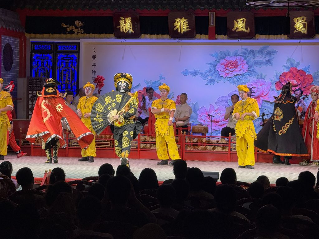 Este espetáculo não é uma ópera clássica como as europeias, é uma performance completamente diferente mas tradicional nesta região. A Ópera de Sichuan mistura música, acrobacias, marionetas, comédia e o famoso “face changing” — uma técnica em que os atores mudam de máscara em segundos, sem que se perceba como. É colorida, vibrante e cheia de ritmo. Mesmo sem entender mandarim, vale pela estética e pela energia. Nós fartamo-nos de pesquisar online e pedir aconselhamento no hotel, mas a comunicação na China não é facil em lado nenhum, e acabamos a comprar bilhetes para um espetáculo mais vocacionado para turistas, que não era exatamente o que tínhamos em mente. Apesar disso foi uma experiência engraçada, e podemos ver ao vivo os trajes tradicionais e uma performance da famosa troca de máscaras.