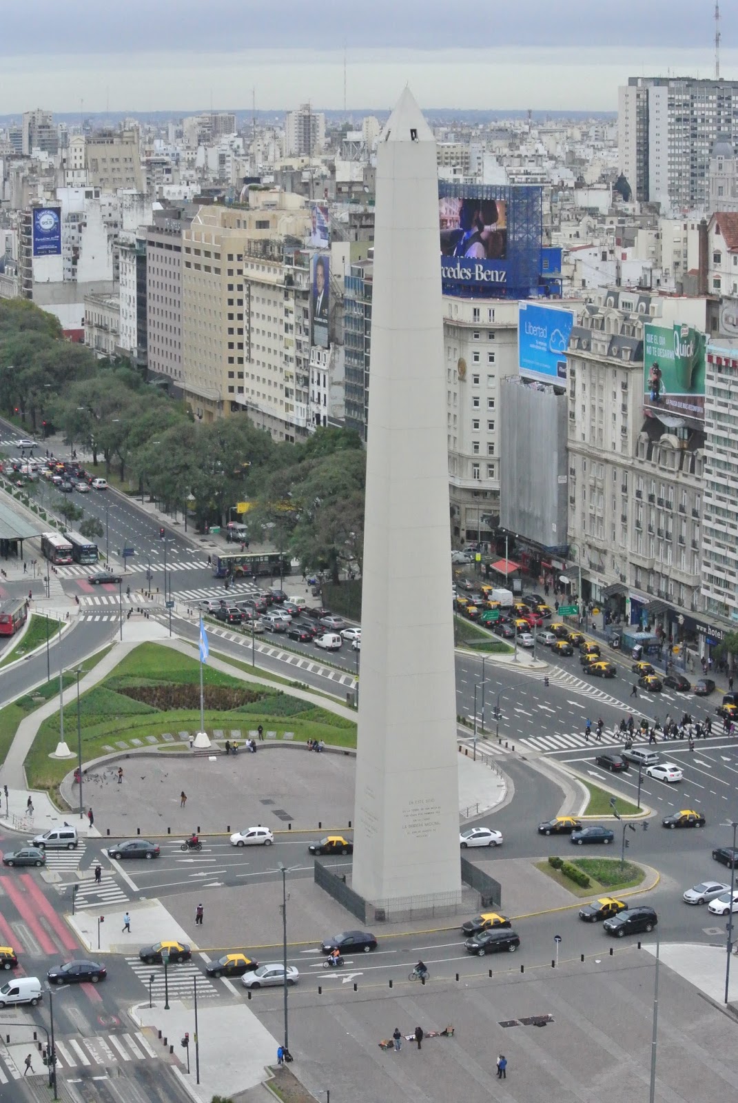 Dica importante: As fotografias da tiradas do alto da 9 de Julio foram conseguidas do último piso do Hotel Panamericano, um 5 estrelas modesto perto do Obelisco. Tinham-me dito que havia uma cafetaria no último piso e eu muni-me do meu ar confiante de hóspede five stars, entrei pelo hotel dentro directa ao elevador (antes que fosse barrada por algum segurança) e carreguei para subir ao último piso. Só que quando cheguei lá cima e a porta se abriu estava… dentro do spa. Supostamente não devia estar ali sem ser hóspede, mas estavam a preparar um evento e o meu ar equivocado e inocente conseguiu arrancar autorização para ir num instante à varanda tirar umas fotos e voltar. Informaram-me que a câmara da cidade organiza um tour semanal à cidade que inclui uma subida ao topo do hotel para ‘ver as vistas’. Podem tentar a abordagem oficial ou perder a vergonha e tentar o mesmo que eu.