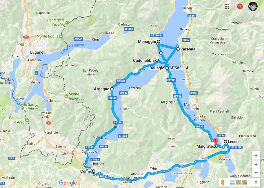Como podem ver, começamos e acabamos em Malgrate – onde estávamos alojados – e fizemos duas espécies de triângulos. O maior e inferior foi feito de carro, e o menor e superior de barco.