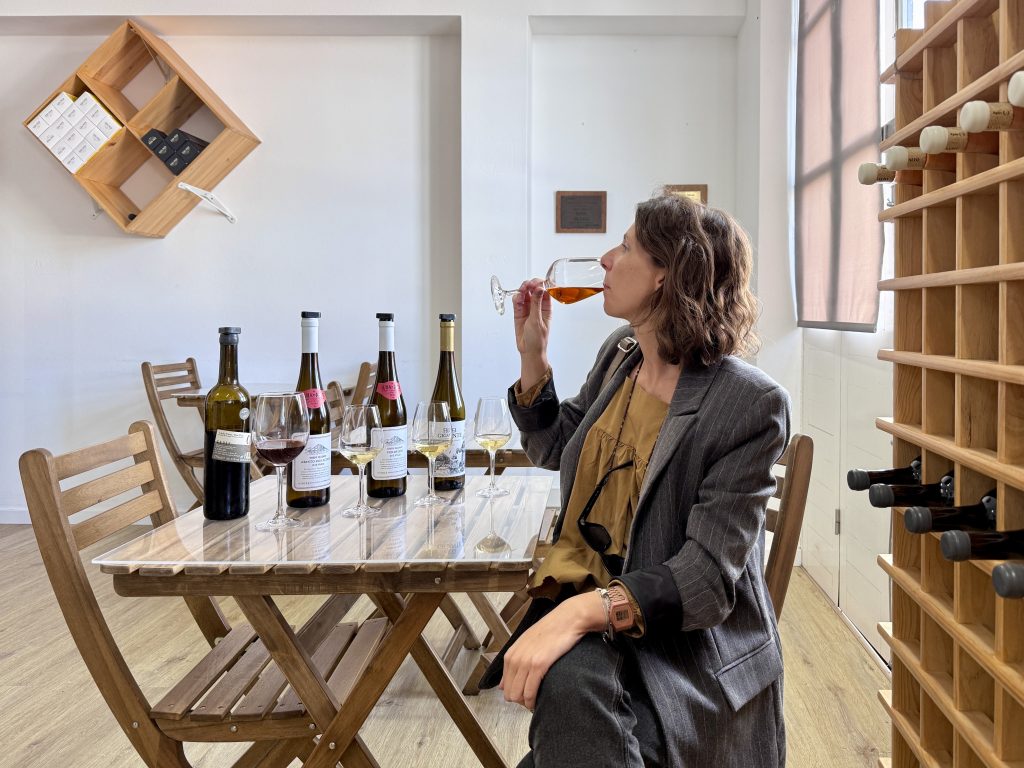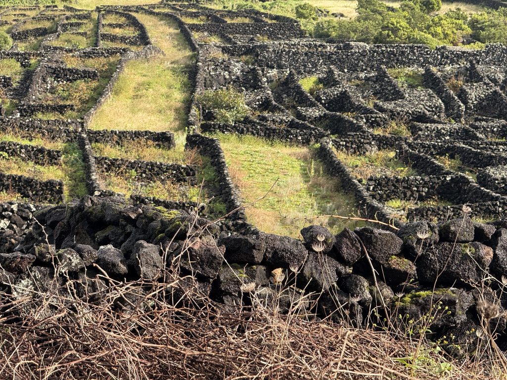 Logo de manhã passei pela Adega Cooperativa do Pico, onde fiz uma prova de vários vinhos da ilha (bem, já eram 11h, acho que estava a valer Kkkkk). Estes vinhos são únicos porque nascem de um solo improvável: lava negra basáltica, extremamente pobre em nutrientes, onde as vinhas crescem protegidas por muros de pedra seca — os famosos currais. Estes muros não só defendem as videiras do vento e da maresia, como absorvem o calor do sol durante o dia e o libertam à noite, criando um microclima perfeito para a maturação das uvas. A proximidade do mar acrescenta ainda uma salinidade muito própria, que se sente no copo, sobretudo nos vinhos brancos. São vinhos minerais, tensos e com carácter.