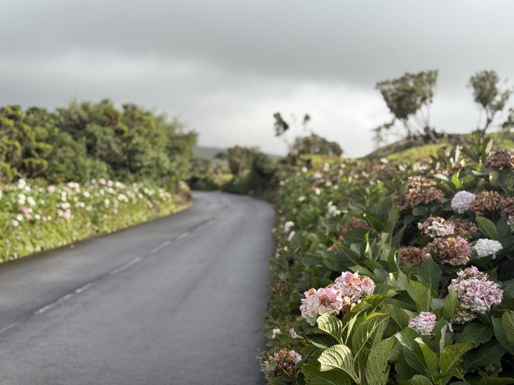 Por fim, não deixem de fazer um troço da EN3, em direção ao centro da ilha. A estrada serpenteia entre paisagens verdes, ladeada de hortênsias, e oferece vistas lindíssimas. Cá para baixo, o Faial surge em frente; cá para cima, a montanha do Pico deveria dominar o horizonte… deveria. No meu caso, o tempo não colaborou e o Pico esteve sempre encoberto, escondido nas nuvens. Ainda assim, confesso que isso não tirou magia à experiência — pelo contrário, só reforçou a ideia de que esta ilha tem o seu próprio ritmo e que nem tudo se revela à primeira. E eu claramente, ia perceber durante a minha estadia que teria mesmo que voltar.