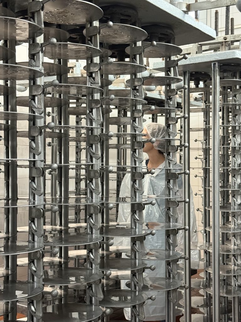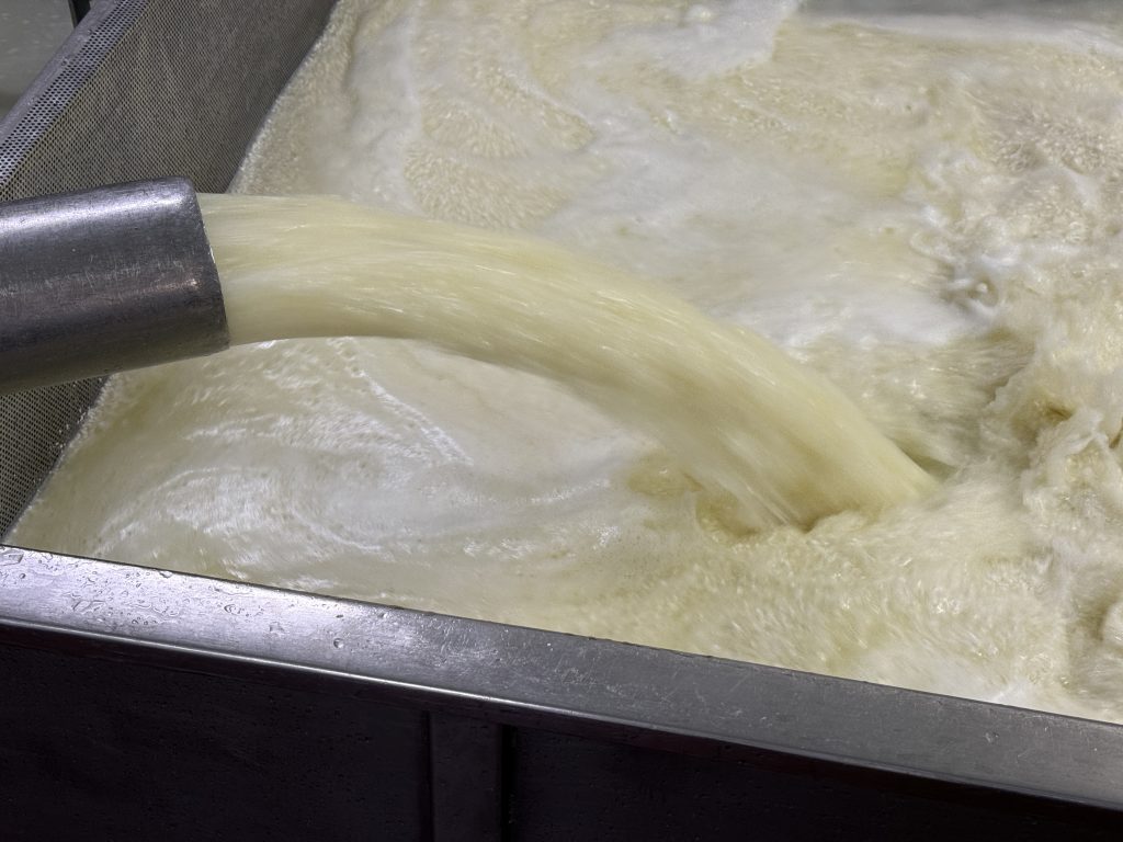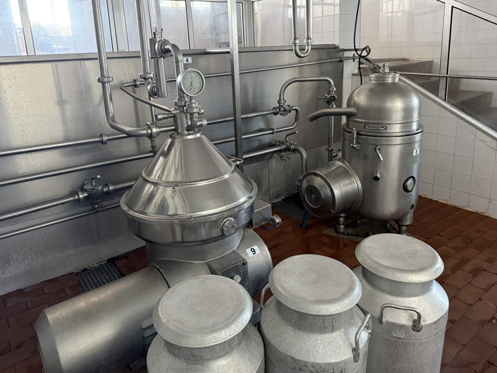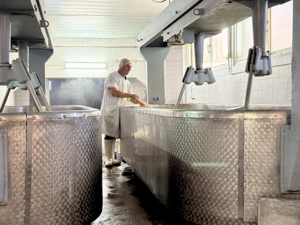 Começamos esta visita pela entrada do leite que abastece grandes cubas que vão garantir a produção semanal. Tal como nos primeiros tempos de funcionamento da empresa, ainda hoje o abastecimento é feito a 100% por cooperativas locais, o que garante a origem do leite na região. Essa proximidade não só assegura qualidade e frescura, como também imprime ao queijo um sabor único, marcado pela terra e pelas estações. Apesar das vacas se alimentarem de forma diferente ao longo do ano, a continuidade dos produtores locais faz com que a identidade do sabor se mantenha reconhecível geração após geração.