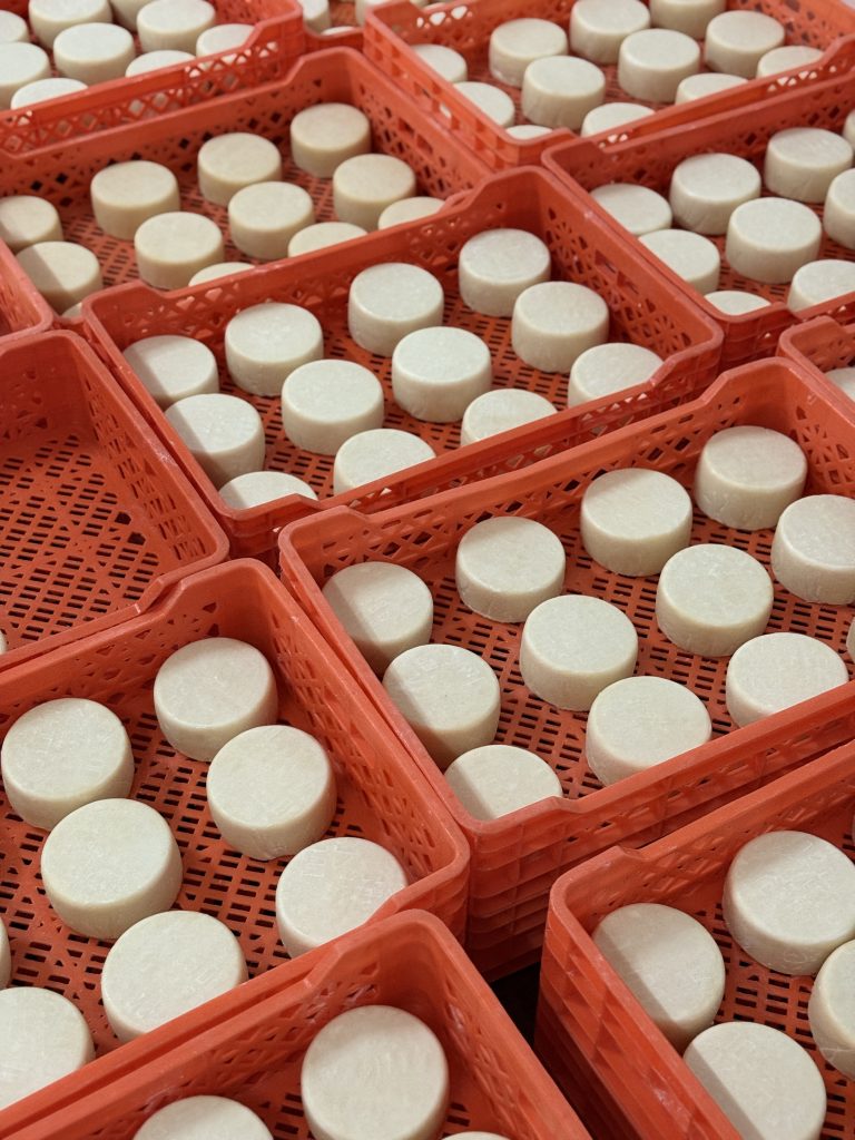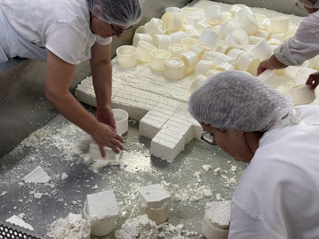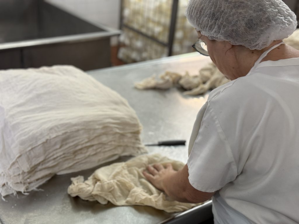Manuel, funcionário da Marinhas há 44 anos, é o primeiro rosto com quem nos deparamos na visita à área produtiva. Recebeu-nos com disponibilidade e orgulho, enquanto acompanhava cuidadosamente o processo de coagulação do leite desnatado em grandes tanques, lado a lado com uma jovem engenheira que hoje dá continuidade a esse saber. Mas a alma da fábrica não está apenas nele: a grande maioria da equipa é composta por mulheres que, com mãos experientes e precisas, preparam os moldes, colocam os coalhos e asseguram a prensagem dos queijos. Mais do que rostos familiares, são guardiãs de um conhecimento transmitido de geração em geração. Muitos dos funcionários cresceram ali, aprenderam com os mais velhos e hoje lutam para manter viva a essência da Marinhas. Num tempo em que é cada vez mais difícil encontrar novas gerações dispostas a abraçar esta cultura, o que aqui se preserva ganha ainda mais valor. Tudo é feito com amor — desde o cuidado com o leite até à viragem dos queijos nas prateleiras da câmara frigorífica.