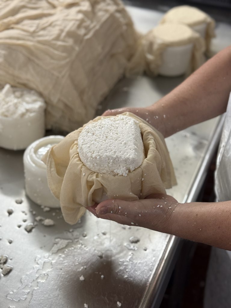 Seguimos para a fase seguinte do processo onde acompanhamos a moldagem do queijo, feita manualmente, e os primeiros passos de seca e cura. Daqui entramos nas câmaras de cura, protegidas por grossas paredes de pedra do edifício original, onde se mantêm o ambiente ideal para a maturação dos queijos. A temperatura, a humidade e a ventilação são controladas com precisão, permitindo que cada peça desenvolva textura, aroma e personalidade ao longo do tempo.